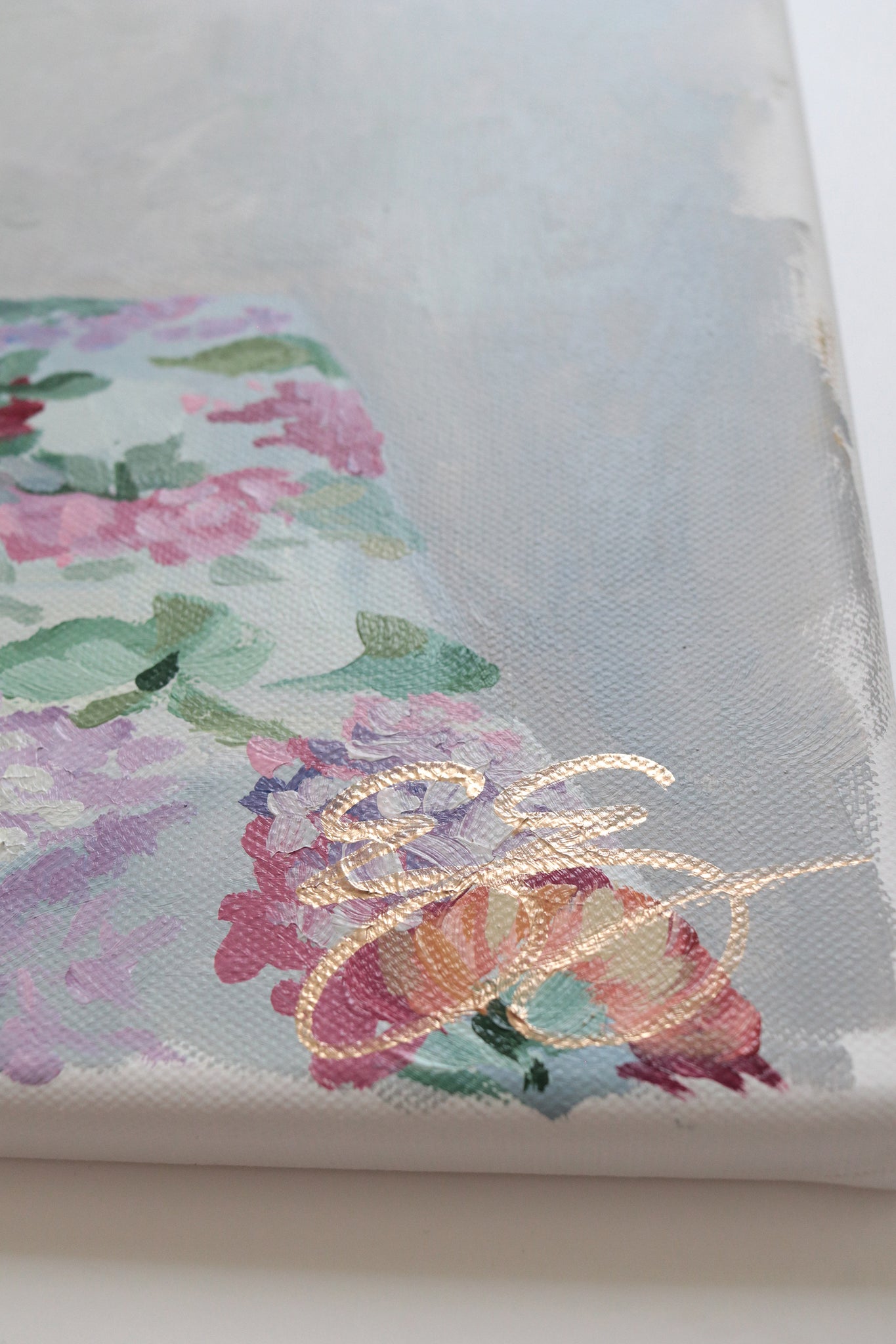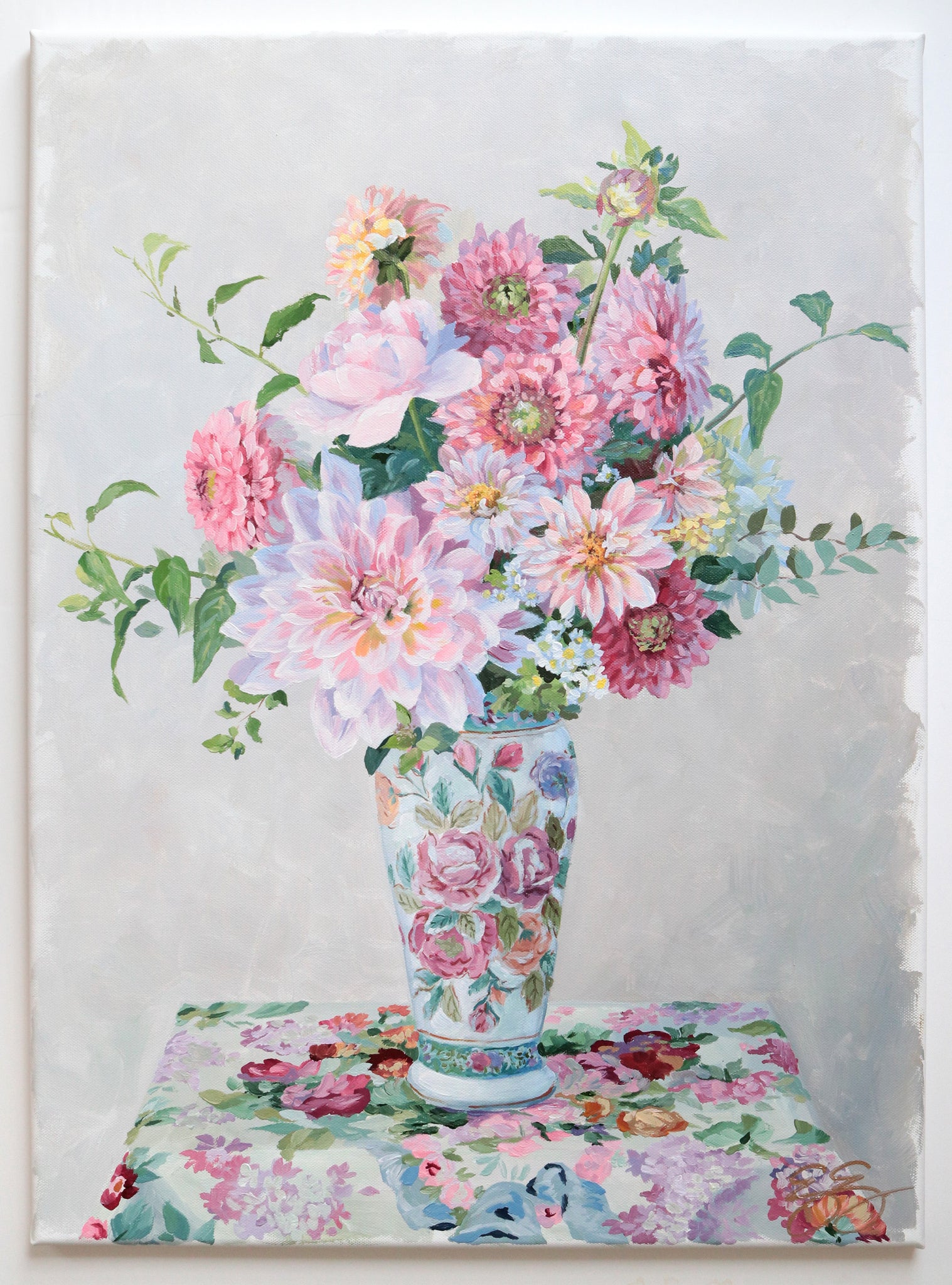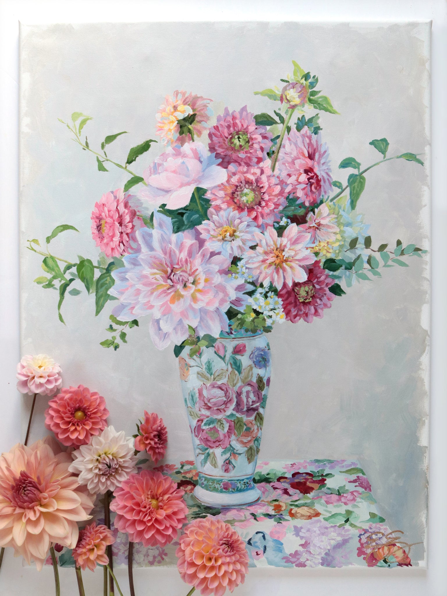 A year in the making, I spent all summer tending my garden and growing my relationship with the flowers I paint. I carefully selected the flowers, greens, vintage vessel, and fabric to capture the mood of abundance.