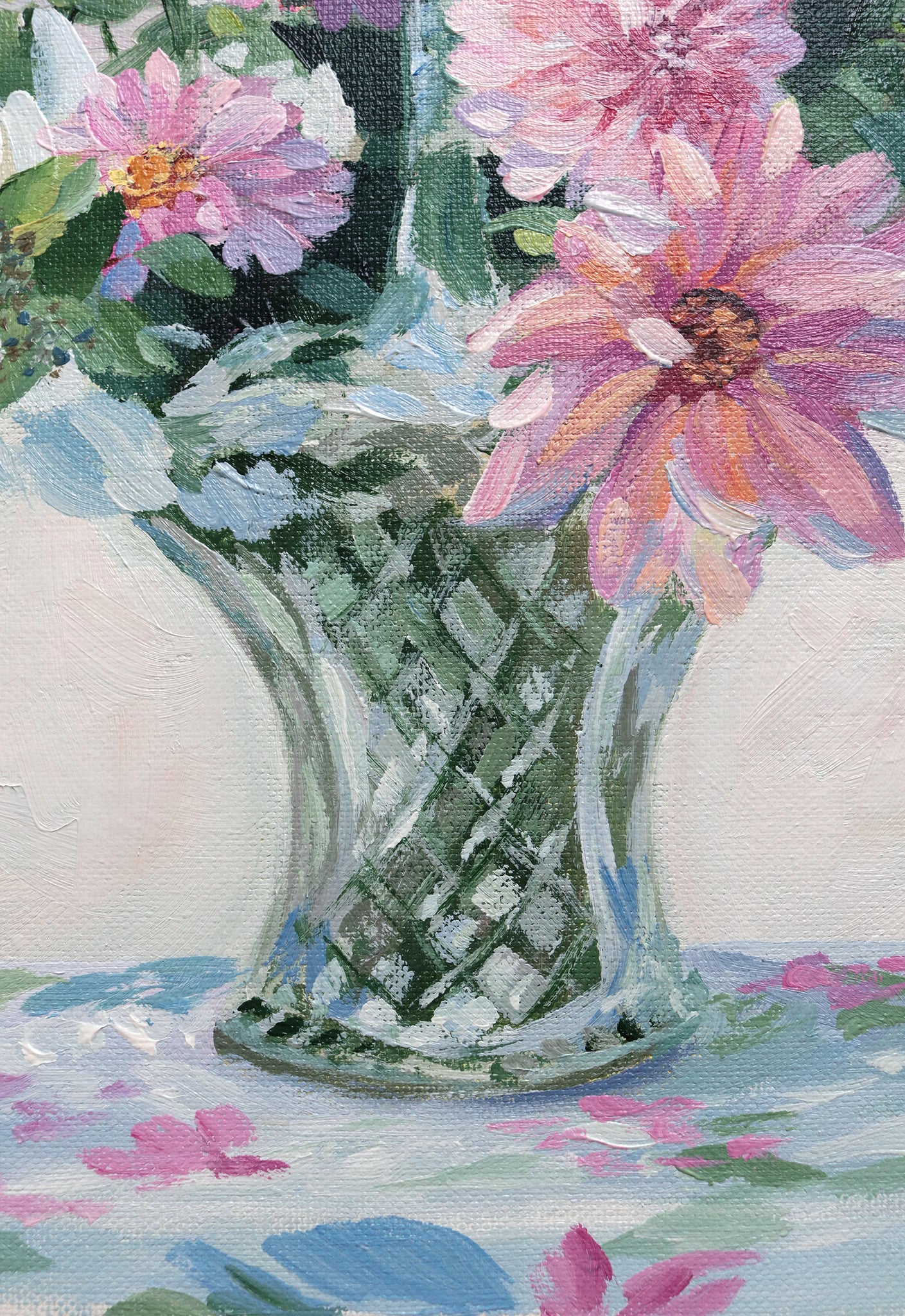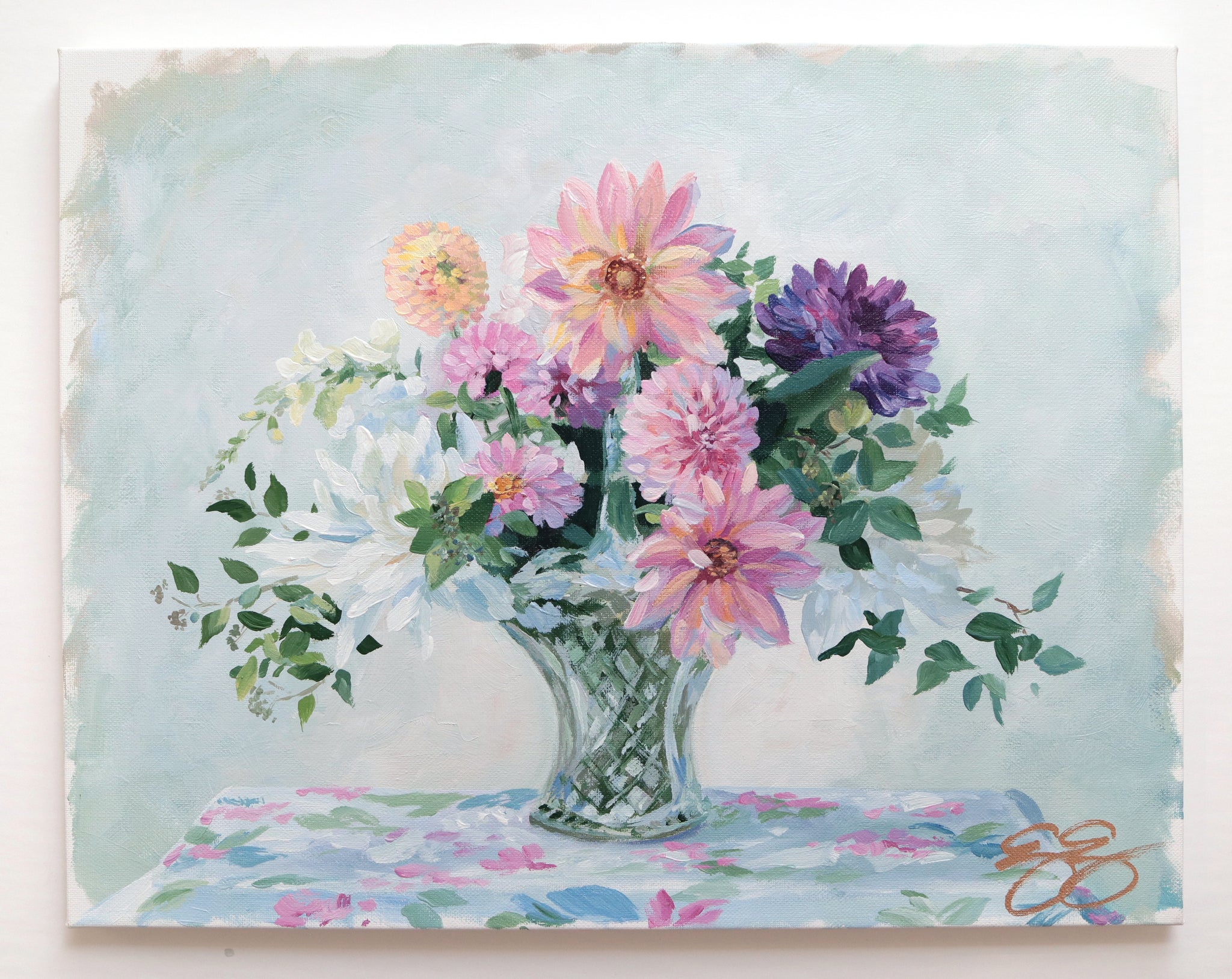 A year in the making, this arrangement began with the seeds that I collected from my garden last fall. I spent all summer tending the garden and growing my relationship with the flowers I paint. I carefully selected the flowers, greens, my grandmother's crystal basket, and vintage fabric to capture the mood of abundance.