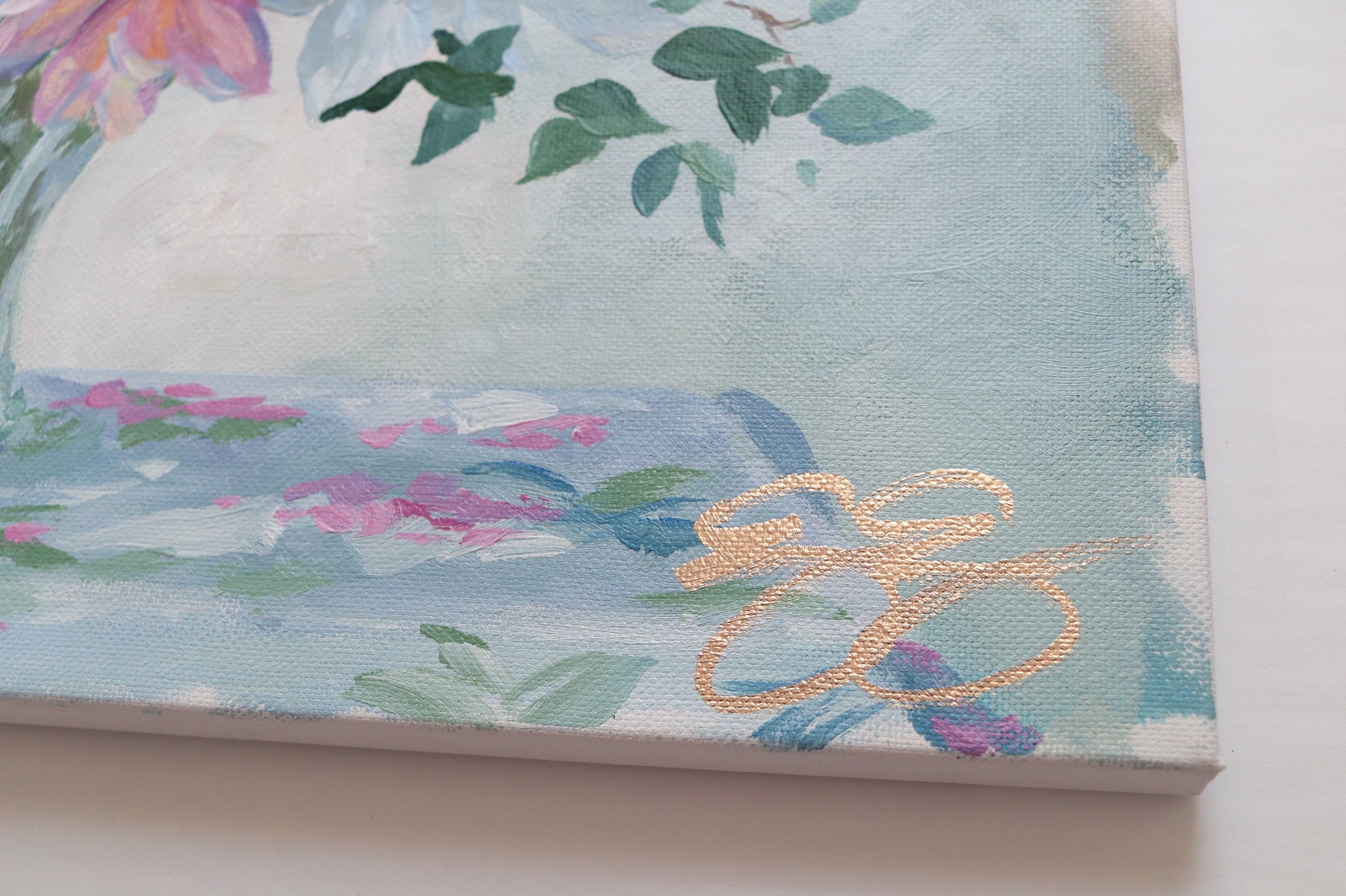 This is an original acrylic painting on stretched canvas measuring 14 x 18 x 0.75 inches. It is finished with a UV-protective varnish.