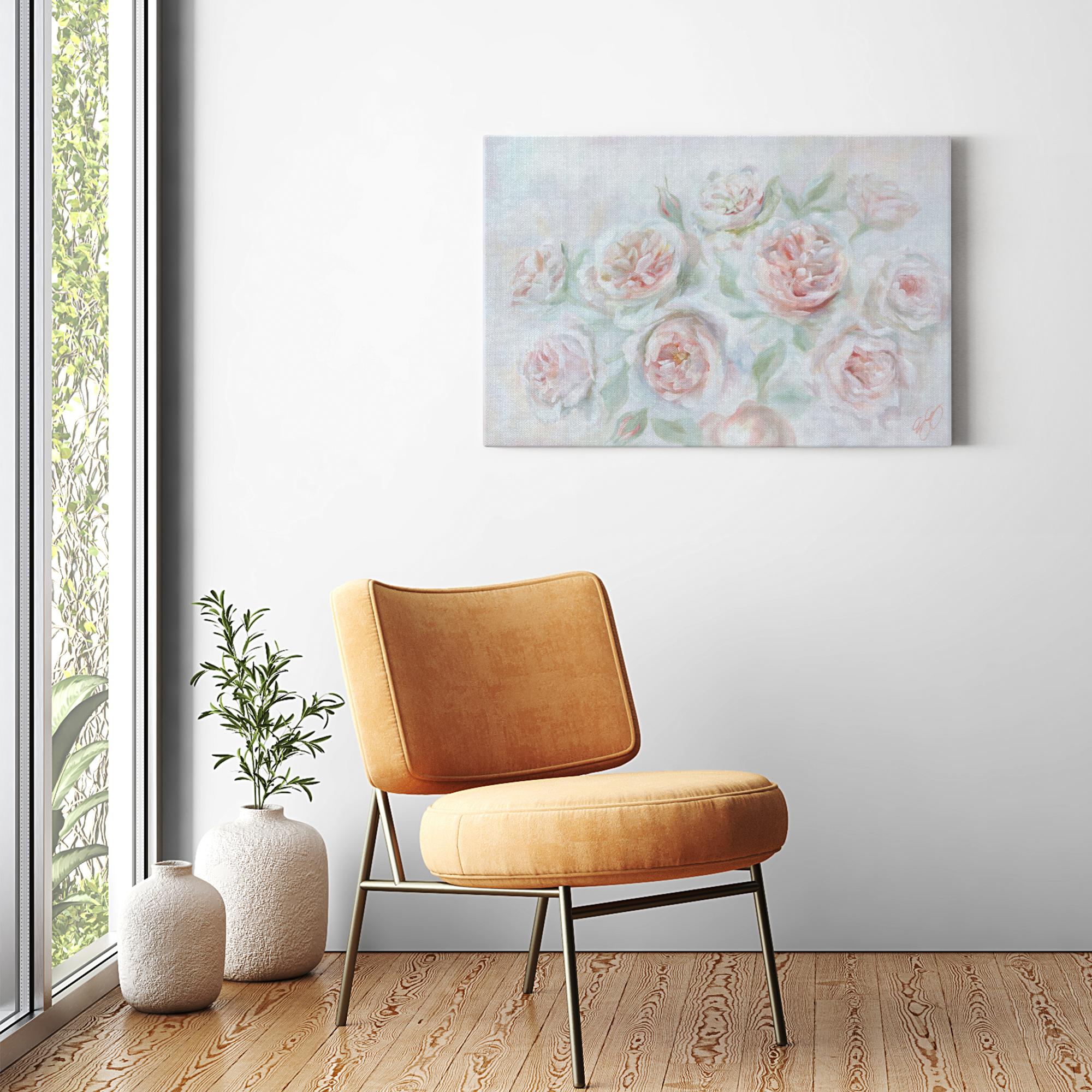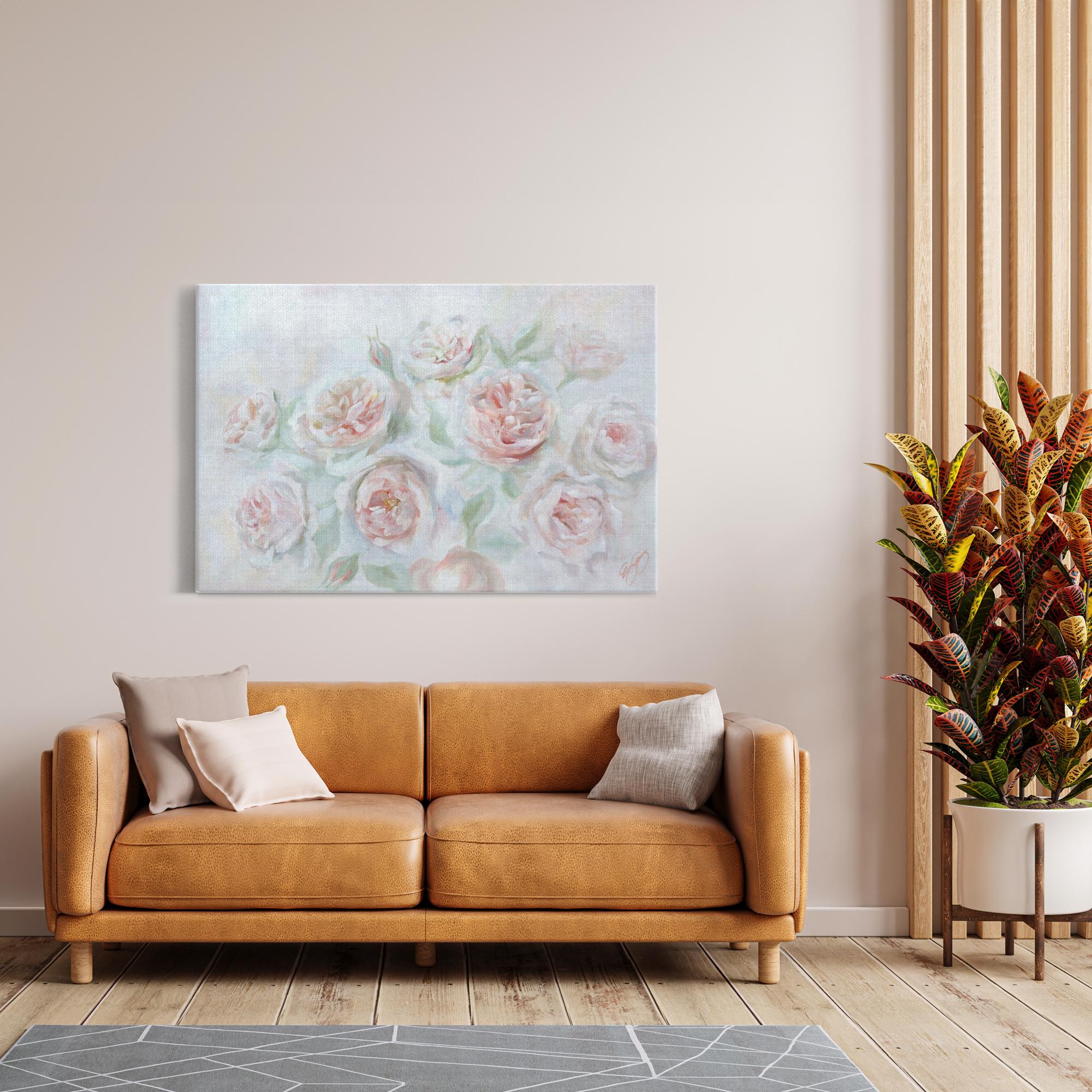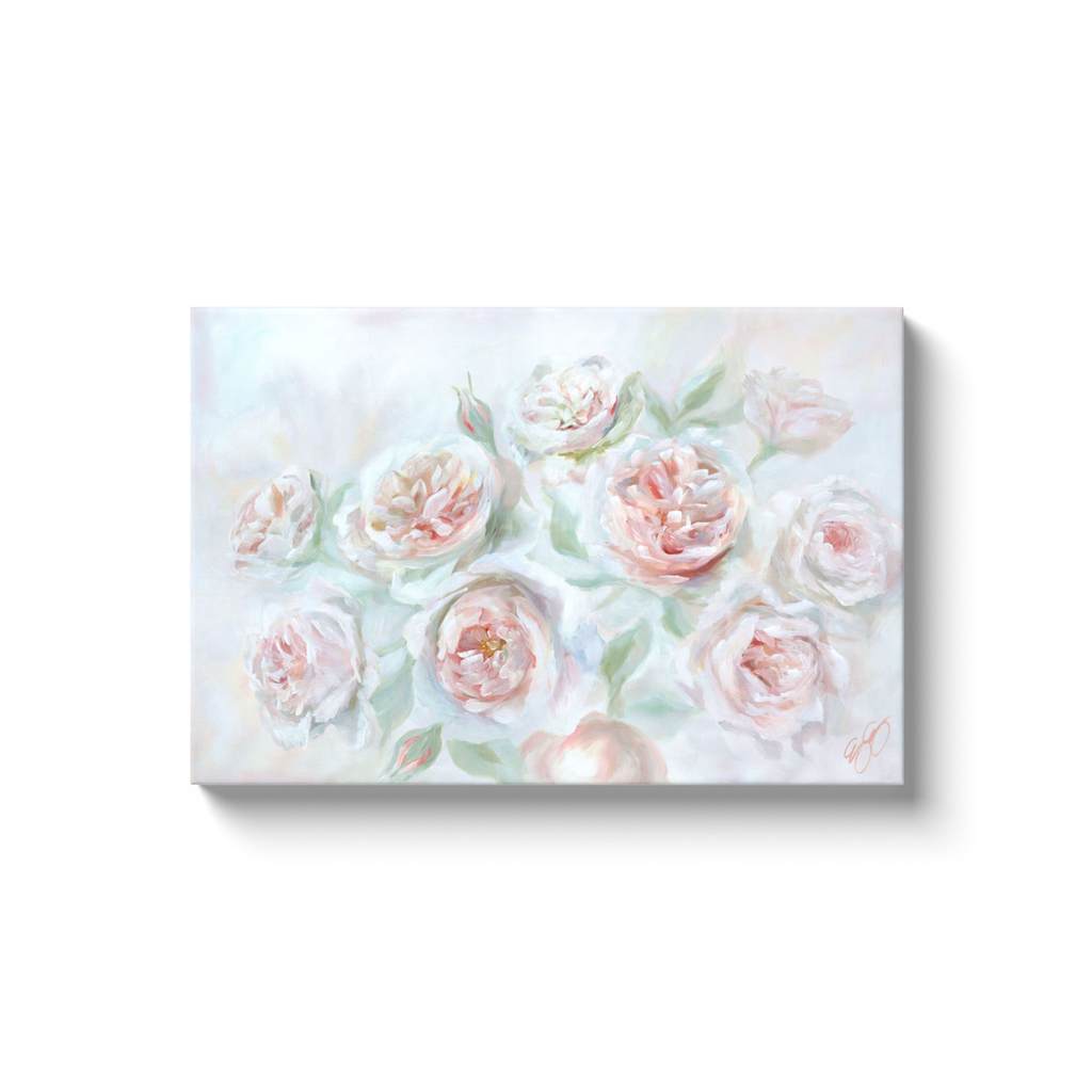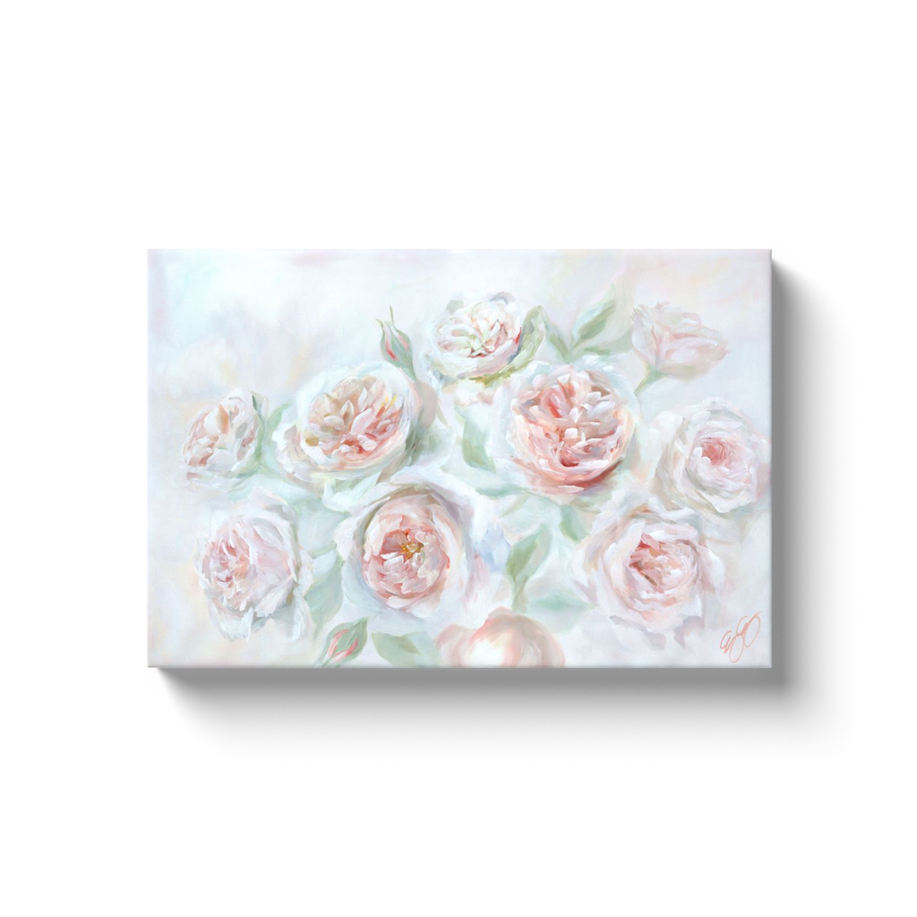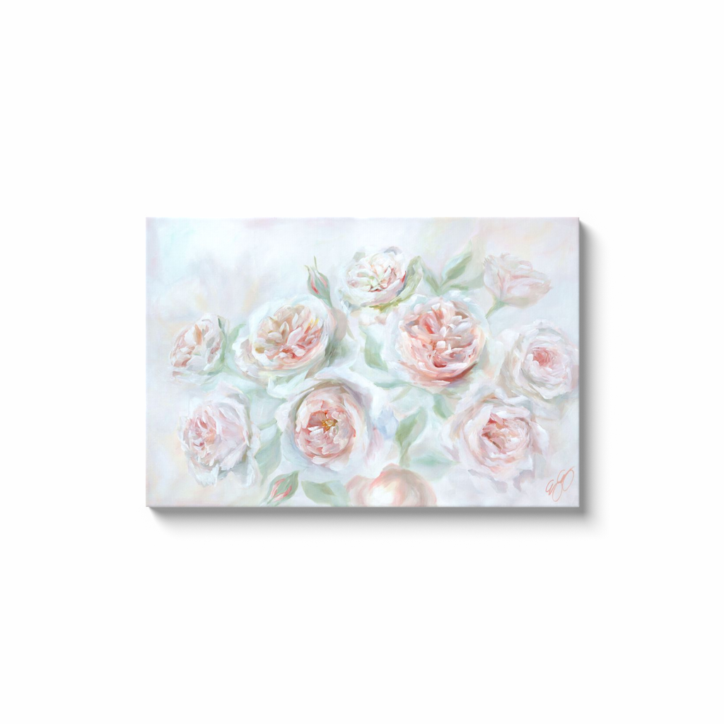 One of my all-time favorite paintings is reproduced as a fine art print on a canvas wrap. My painting shows a bouquet white garden roses in a soft, ethereal style. The image is printed with archival inks on canvas, then stretched around a wooden frame and finished for easy hanging. The 1.25" edges of the wrap are white.