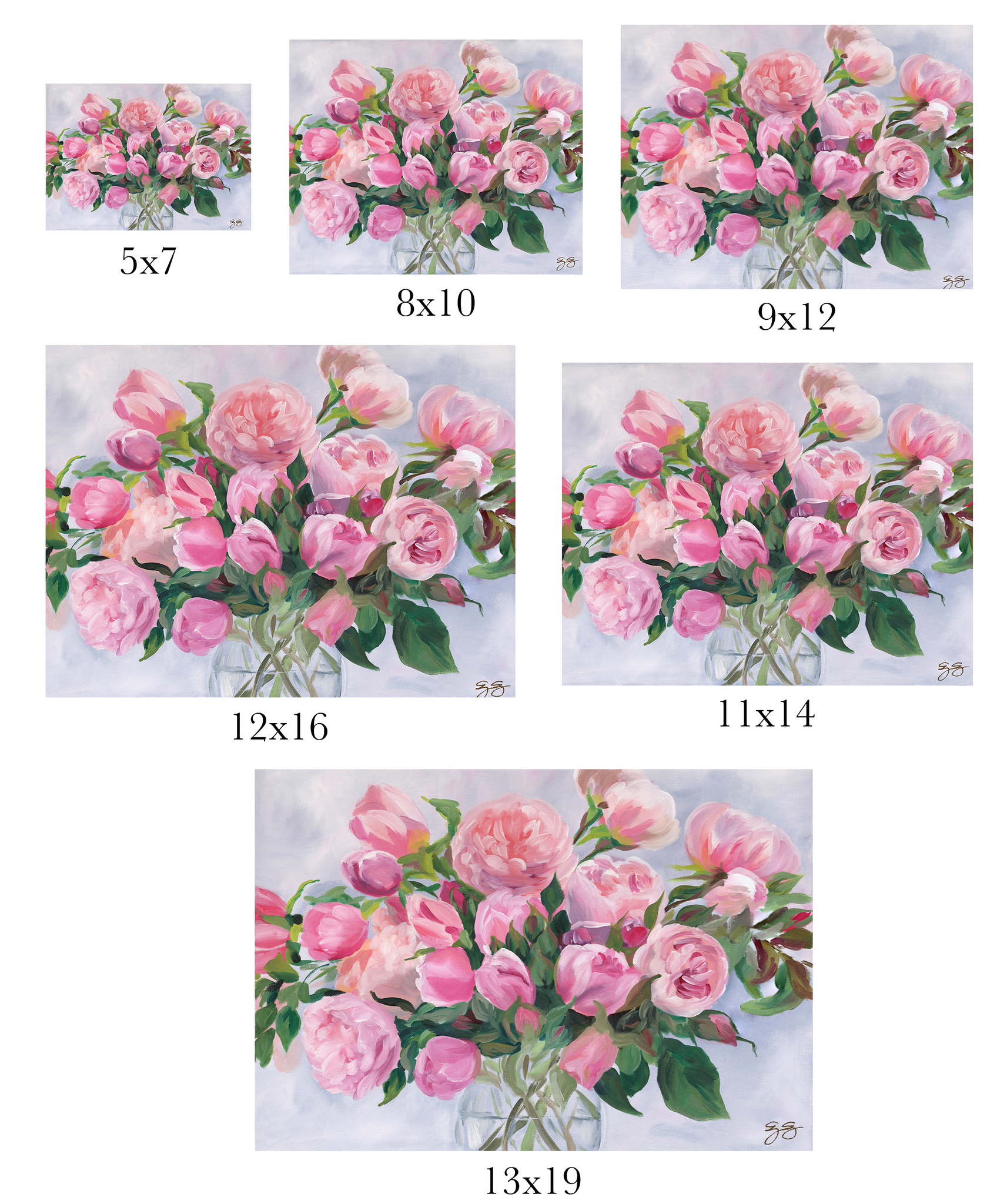 My original painting of pink garden roses in a clear glass vase is reproduced as a fine art print on quality paper.