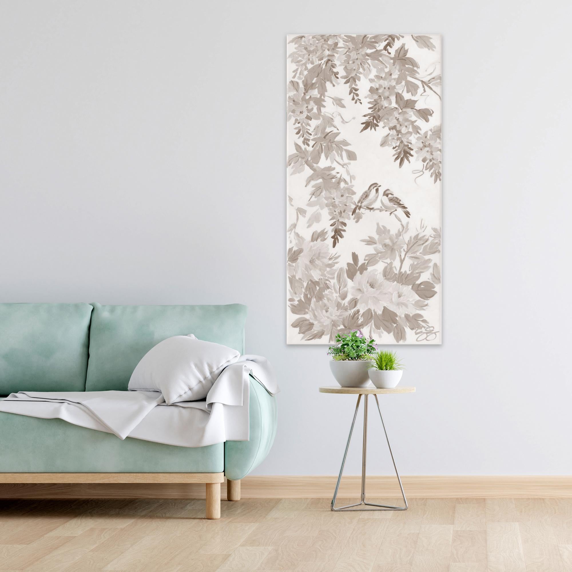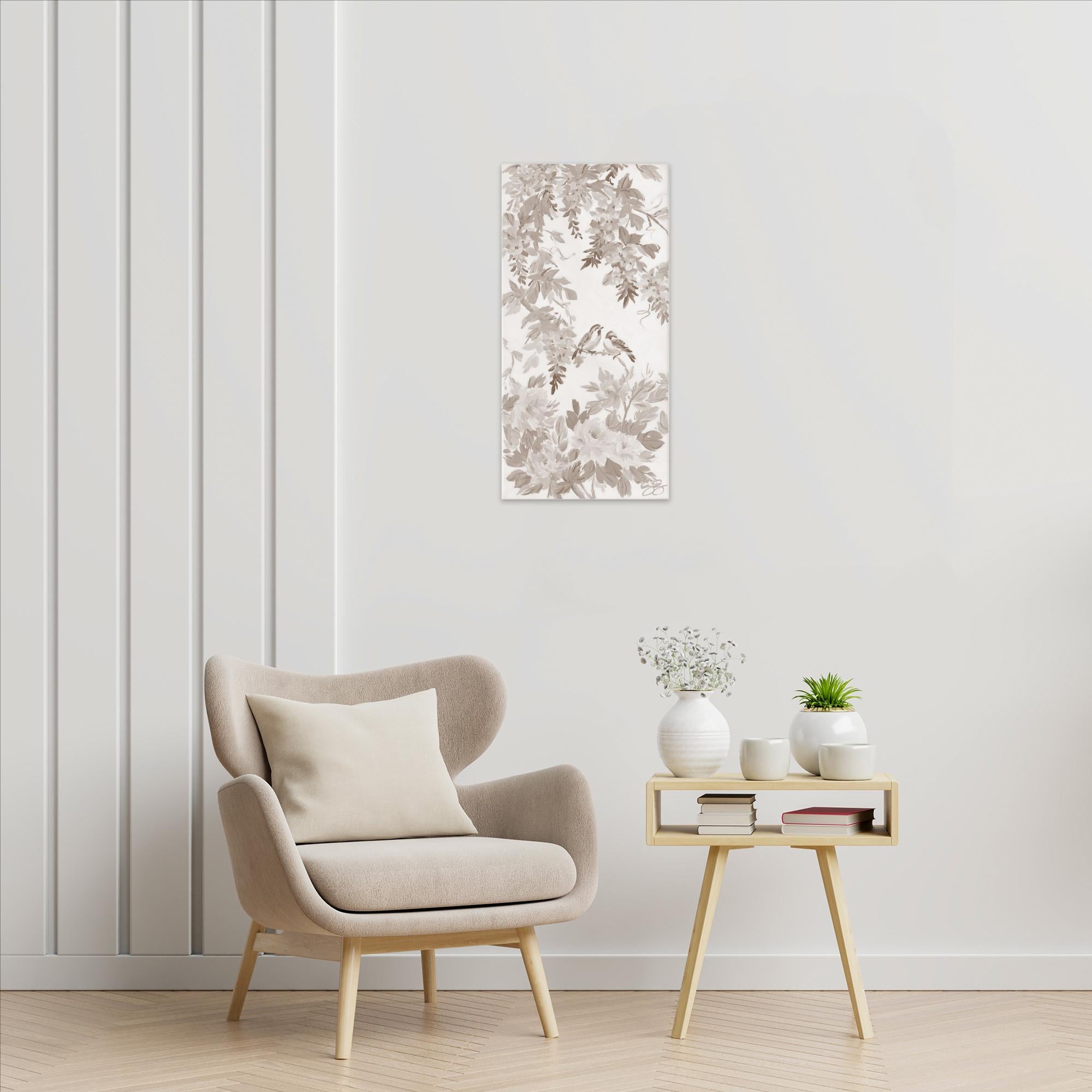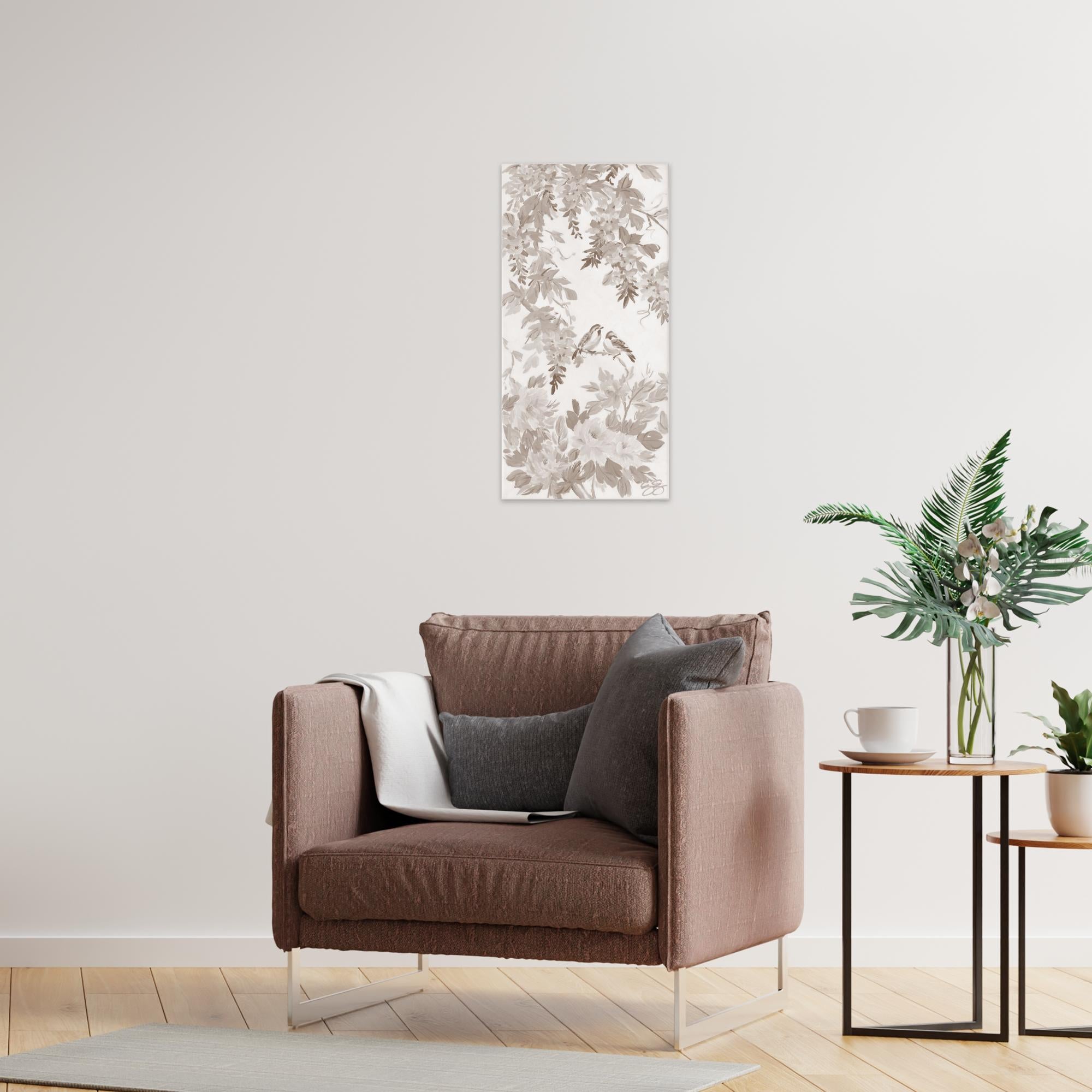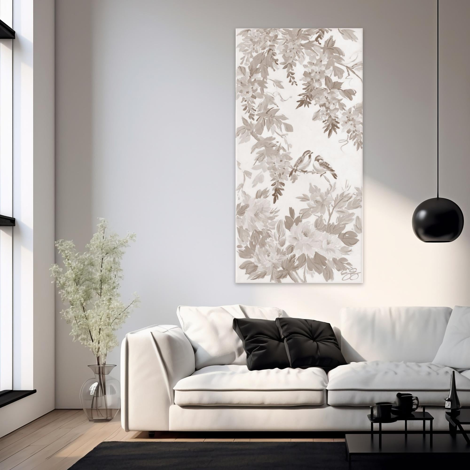 My original painting is reproduced as a print with art-quality paper and ink. My chinoiserie art is inspired by my own mixed Chinese heritage; I love to combine western and eastern painting techniques in a new way. This print of my painting of two birds sitting among wisteria and peonies will ship rolled in a tube and will need to be gently flattened and framed.