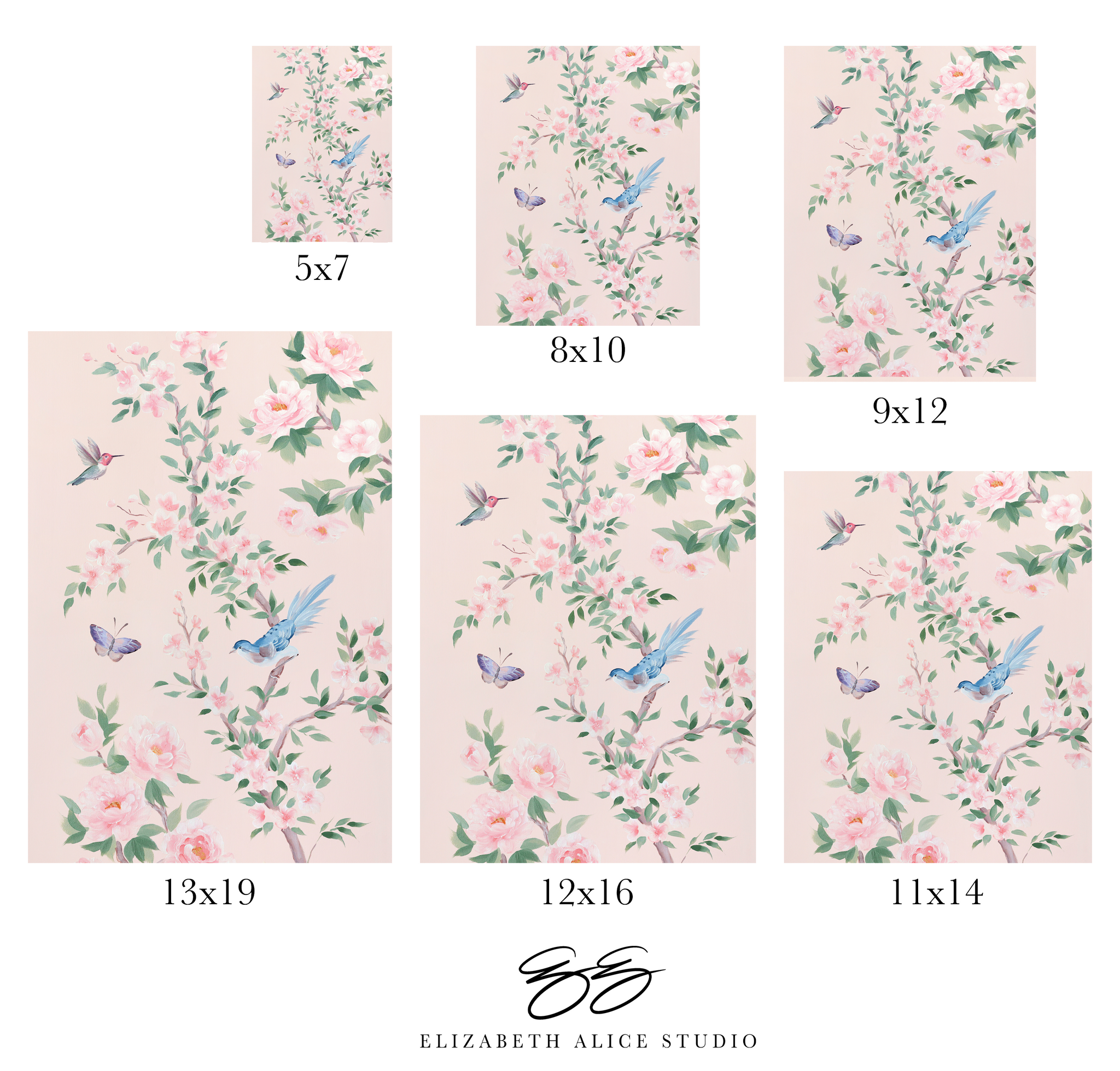 My original chinoiserie painting is reproduced as a fine art print on quality paper. A bluebird, hummingbird, and butterfly play around pink cherry blossom and peony flowers.