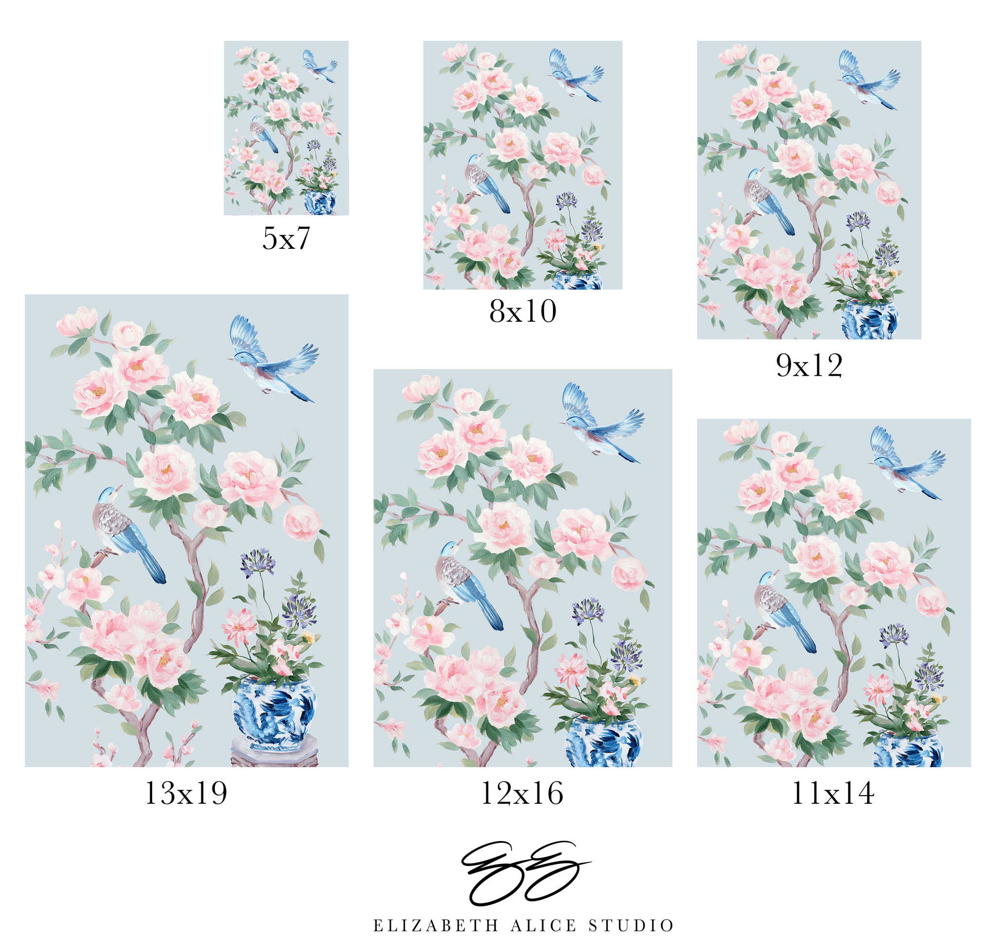 My original chinoiserie painting is reproduced as a fine art print on quality paper. Bluebirds fly around a blooming peony bush, while a blue and white planter of flowers sits nearby.