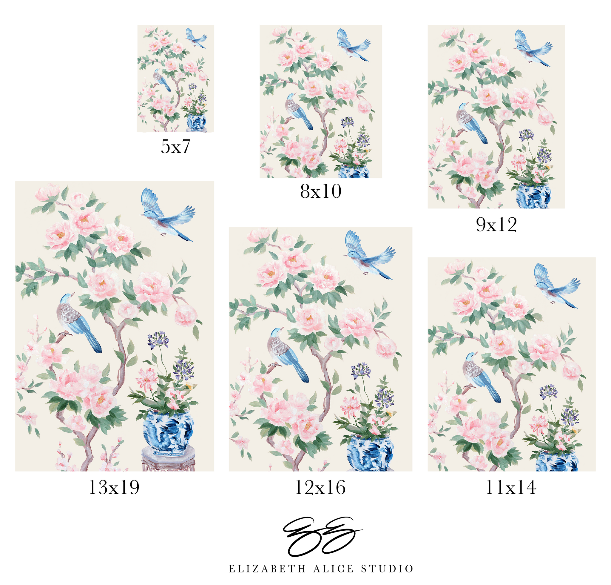 My original chinoiserie painting is reproduced as a fine art print on quality paper. Bluebirds fly around a blooming peony bush, while a blue and white planter of flowers sits nearby.